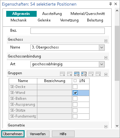 Um Positionen einer Gruppe zuzuordnen, sind diese im Vorfeld zu selektieren. Die Selektion kann im Zeichnungsbereich über das Aufziehen eines Rahmens oder über das Fenster „Modell“ erfolgen. Die Zuordnung der selektierten Positionen erfolgt im Eigenschaftenfenster über das Kapitel „Allgemein“. Wir setzen in der Frage „Gruppen“ ein Häkchen in das Kontrollkästchen der gewünschten Gruppe und bestätigen dies mit „Übernehmen“. Damit sind alle markierten Positionen der Gruppe zugeordnet.