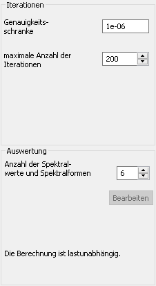 Die Berechnung erfolgt für die gewählte Anzahl der Eigenwerte / Eigenvektoren (festzulegen im Feld "Auswertung"). Für die einzelnen Eigenwerte wird die übliche Unterraumiteration durchgeführt.