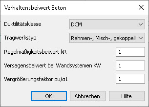 In diesem Dialog findet die Auswahl der Duktilitätsklasse für Betonbau nach DIN EN 1998-1, NDP zu 5.2.1 (5) statt. Hiervon ist die Berechnung des Verhaltensbeiwerts q für die Ermittlung der seismischen Erregungen abhängig.