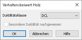 In diesem Dialog findet die Auswahl der Duktilitätsklasse für Holzbau nach DIN EN 1998-1, NDP zu 8.3 (1) statt. Hiervon ist die Berechnung des Verhaltensbeiwerts q für die Ermittlung der seismischen Erregungen abhängig.