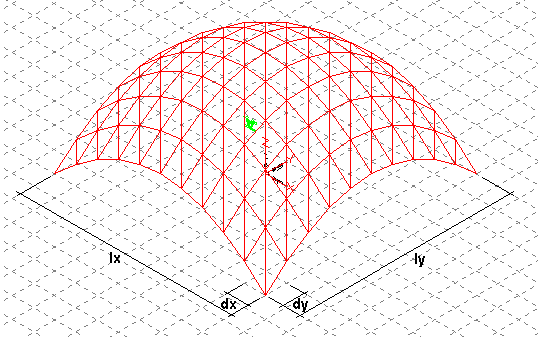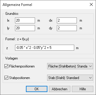 In diesem Dialog definieren Sie die Abmessungen und die Gestalt eines räumlichen Tragwerkes fest. Die Form des Tragwerks wird durch eine Gleichung der allgemeinen Form z = f(x,y) bestimmt. Generiert wird nur das reine Tragwerk. Belastung, Auflager und eventuelle Gelenke müssen Sie selbst definieren.