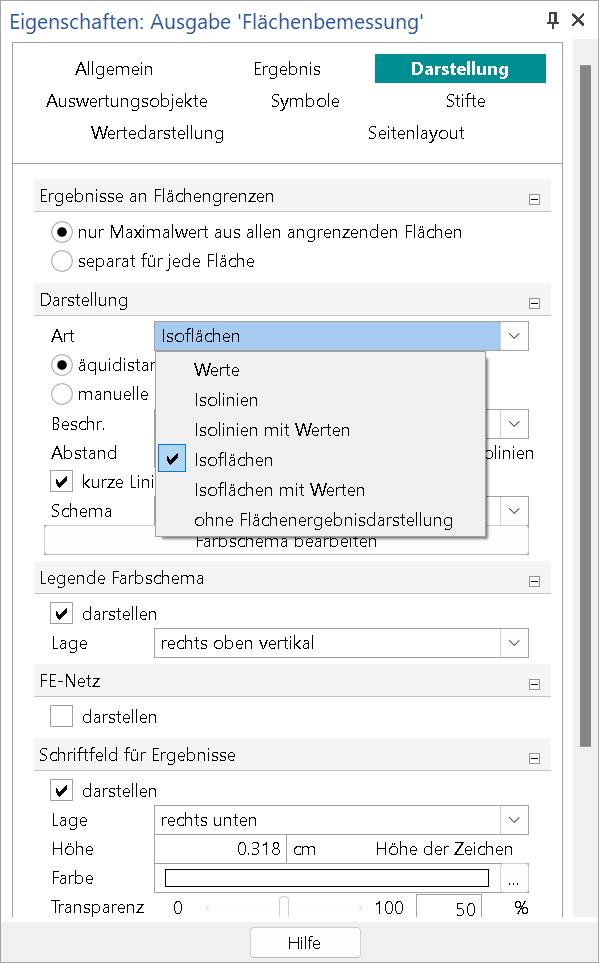 Im Kapitel "Darstellung" wird die Frage „Wie wird das Ergebnis dargestellt?“ bearbeitet. Je nach Ergebnis stehen hier unterschiedliche Varianten der Darstellung zur Auswahl. Bei flächigen Ergebnissen z.B. die Darstellung über "Isolinien", "Isoflächen" oder "Werte".