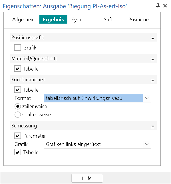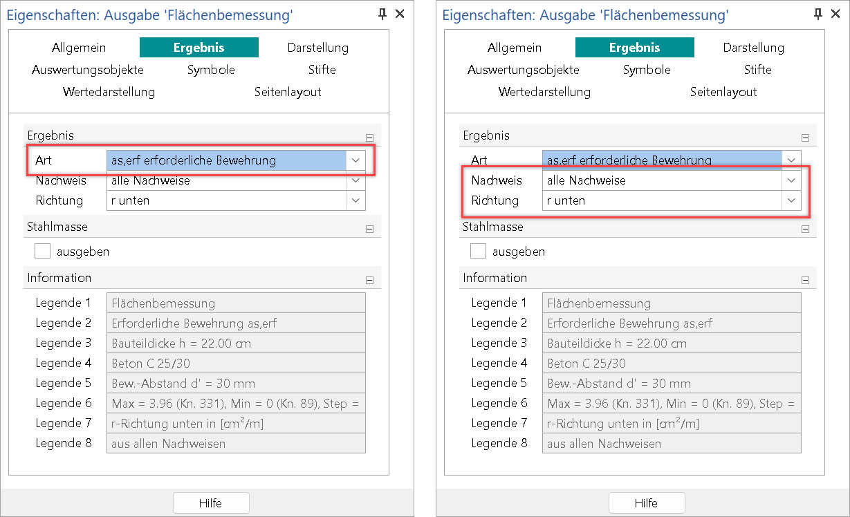 Die Eigenschaften bieten im Kapitel "Ergebnis" die Auswahl der Fragen „Was soll angezeigt werden?“ oder „Welcher Teil des Ergebnisses wird benötigt?“. Dies ist z.B. die Auswahl der erforderlichen unteren Bewehrung aus allen Nachweisen in r-Richtung.