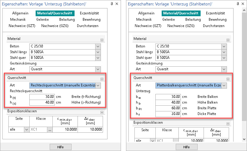 Der Umfang der Eingaben im Eigenschaftenfenster reagiert dynamisch auf bereits vorhandene Eingaben. Zum Beispiel würden bei einem Stahlbeton-Unterzug beim Wechsel von einem Rechteck- zu einem Plattenbalken-Querschnitt weitere Eingabefelder hinzugefügt werden. Im Umkehrschluss entfallen je nach Option auch überflüssige Eingaben.