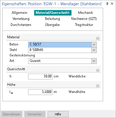 Alle Eigenschaften werden einheitlich in Kapitel und Fragen gegliedert. Je nach selektierter Position wird eine unterschiedliche Anzahl von Kapiteln angeboten. Diese folgen jedoch immer einem einheitlichen Konzept. Angeboten werden Kapitel wie z.B. "Allgemein", "Material/Querschnitt" oder "Nachweise (GZT)". Über die verschiedenen Positionstypen sind die Kapitel immer gleich aufgebaut und enthalten einen vergleichbaren Inhalt. In den verschiedenen Kapiteln werden die Eigenschaften weiter in Fragen gegliedert. Optisch erhalten die Titelzeilen der Fragen eine graue Hintergrundfärbung. Über das "+/–" Symbol können Fragen geöffnet und geschlossen werden. Ein einheitliches Schließen und Öffnen aller Fragen eines Kapitels ist über das Kontextregister oder das Kontextmenü des Kapitels möglich. Diese Option schafft einen schnellen Überblick über alle Fragen. Innerhalb der Fragen ermöglichen verschiedene Eingabevarianten die Bearbeitung der Eigenschaften.