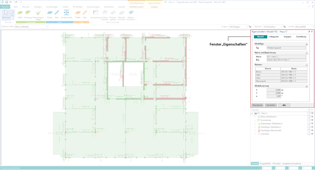 Auf die Eigenschaften aller selektierten Objekte besteht so ein schneller Zugriff mit direkter Änderungsmöglichkeit. Wird z.B. eine Wand selektiert, werden ihre Eigenschaften angezeigt, können kontrolliert und ggf. geändert werden. Mit einem Klick auf "Übernehmen" fügen sich alle Änderungen an der Position in das Modell ein.