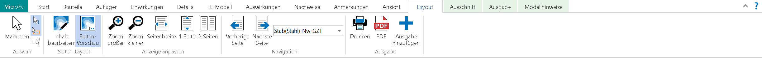 Durch den Wechsel in den Seitenlayout-Modus wird die aktuelle Ausgabe im Drucklayout angezeigt. Der Umfang kann dabei mehrere Seiten umfassen. Die Ausgabe kann direkt gedruckt oder als PDF exportiert werden.
