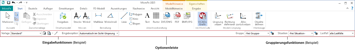 Die Optionenleiste ist unterhalb der Register des Menübands angeordnet. Abhängig von der Eingabesituation werden hier verschiedene Optionen angeboten.