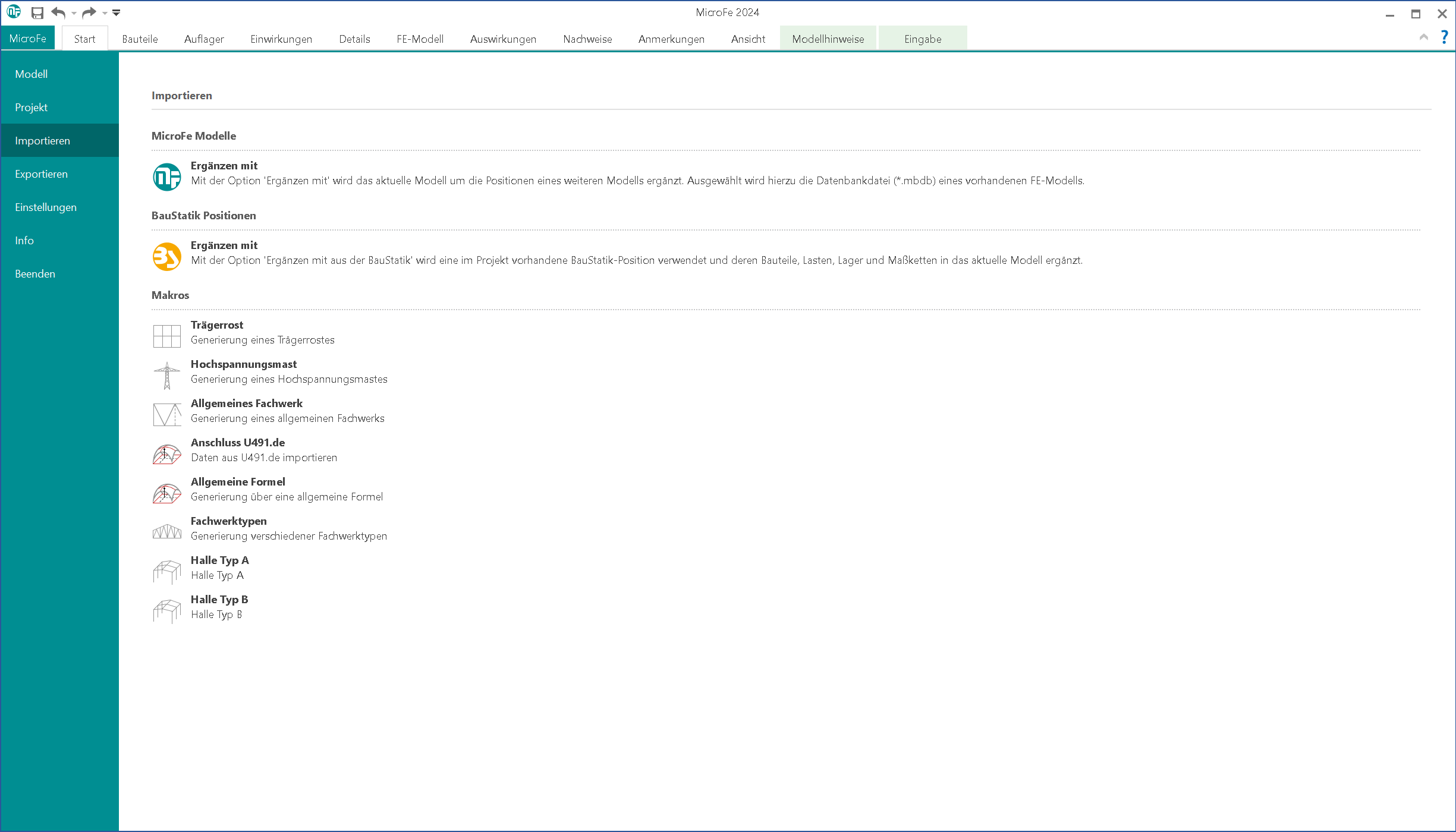 Mit dieser Funktion können alle Bauteile, Lasten, Lager und Maßketten aus einer vorhandenen BauStatik-Position in ein MicroFe-Modell überführt werden. Über diesen Weg werden sich wiederholende Eingabe vermieden, wenn z.B. Anwendungsgrenzen eines Moduls in der BauStatik erreicht sind und der Nachweis in einem offenere FE-System erfolgen soll.
