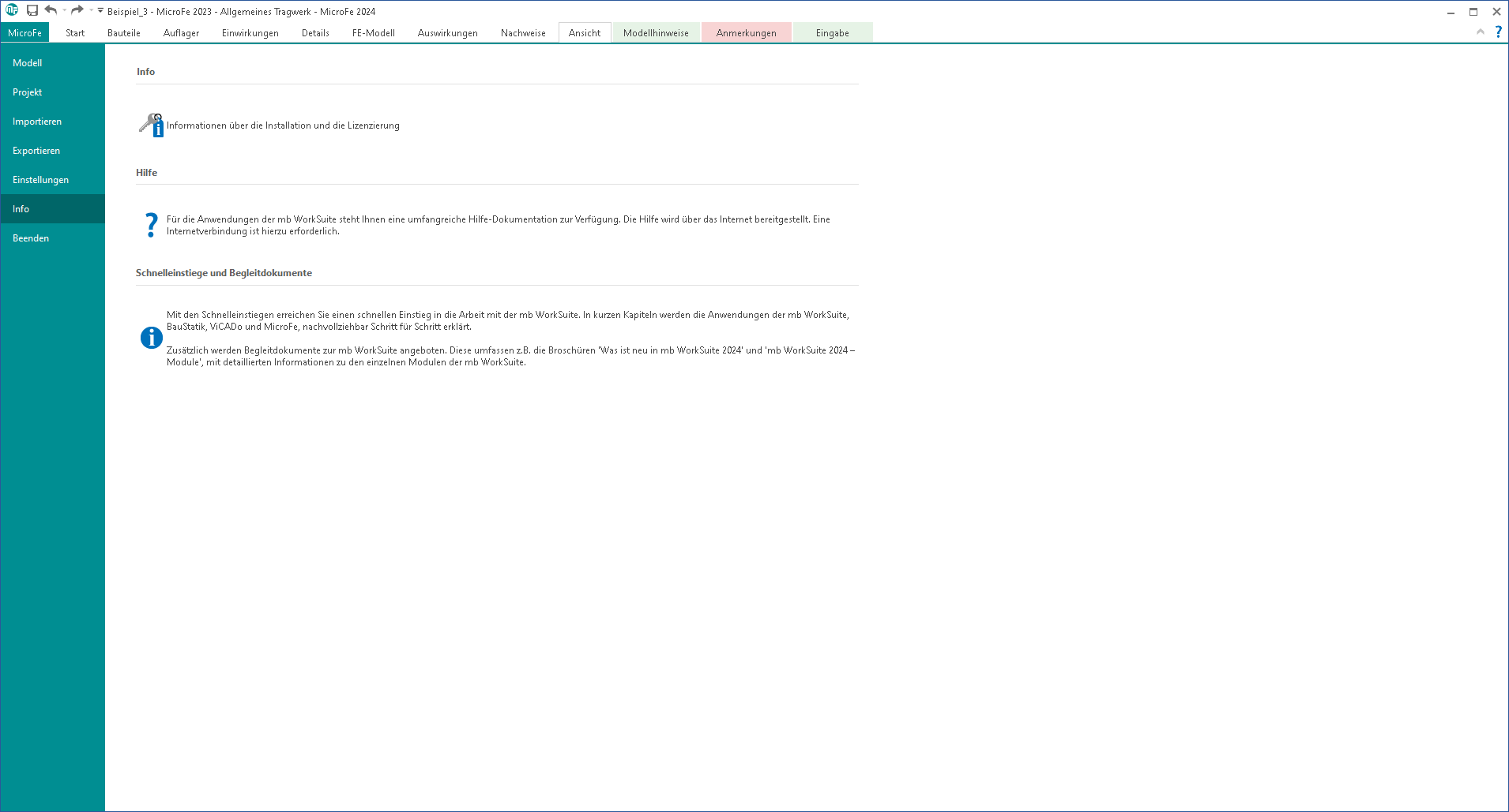 In der Rubrik "Info" finden Sie Informationen zur Lizenzierung. Außerdem erreichen Sie über die Schaltfläche "Hilfe" die Startseite dieser Onlinehilfe. Über die Schaltfläche "Schnelleinstiege" haben Sie Zugriff auf verschiedene pdf-Dokumente für den schnellen Einstieg in Ihre Arbeit mit der mb WorkSuite.