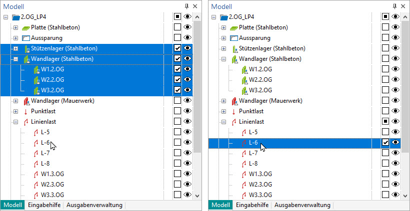 Für ein 2D-Platten- oder 2D-Scheiben-Modell werden hier auf erster Ebene die Positions- und Lasttypen angeboten. Wird die Struktur weiter geöffnet, erscheinen die einzelnen Positionen des Modells. Für 3D-Geschossbaumodelle werden die Geschosse als weitere Hierarchie-Stufe angeboten.