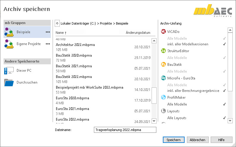 Auf der linken Seite des Dialogs werden die mb Gruppen angeboten. Zusätzlich kann über die Schaltfläche „Durchsuchen“ der komplette Rechner durchsucht und ein Speicherort ausgewählt werden.