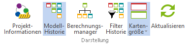 Über den Wechsel der Darstellungsart zu "Modell-Historie" werden alle im Projekt vorhandenen Modelle im Karten-Layout angezeigt. Über einen Linksklick auf eine der Karten werden über einen Pfeil die Abhängigkeiten dieses Modells deutlich gemacht. Es wird erkennbar aus welchem Modell es hervorgegangen ist und in welchem es weiter verwendet wird. Zusätzlich wird der Status der Berechnung über die Ampelmarkierungen gekennzeichnet.