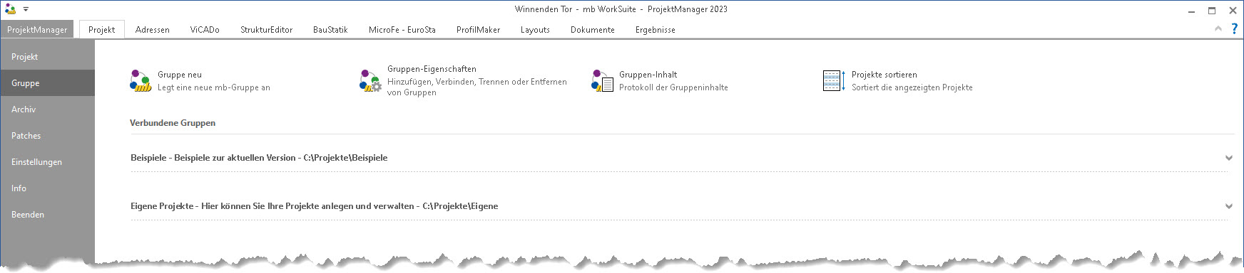 Eine Gruppe ist ein anderer Name (Alias) für einen Pfad (Laufwerkspfad) auf Ihrer Festplatte oder in Ihrem Netzwerk. Nach der Definition einer Gruppe kann mit Hilfe des Gruppennamens auf die Projekte zugegriffen werden, die in diesem Pfad liegen.