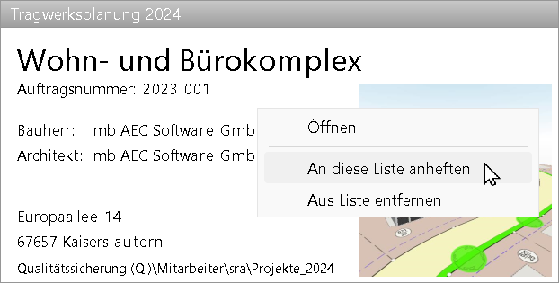 Projekt aus Liste der angehefteten Projekte lösen: Eine Projektkarte können Sie aus der Liste der angehefteten Projekte lösen. Führen Sie einen Rechtsklick über der entsprechenden Projektkarte aus und wählen Sie den Eintrag "Aus Liste lösen". Das Projekt wird danach in der Liste der zuletzt verwendeten Projekte angezeigt.
