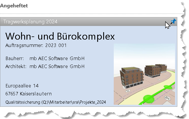 In der oberen rechten Ecke der Visitenkarte wird eine blaue Pinnwandnadel angezeigt, wenn Sie mit der Maus über die Visitenkarte fahren. Wenn Sie darauf klicken, wird die Visitenkarte ebenfalls aus der Liste der angehefteten Projekte entfernt.