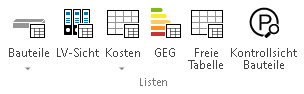 Über diese Auswahlschaltfläche können Listensichten für folgende Bauteile erzeugt werden: