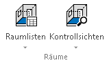 Über die Schaltfläche wird eine neue Sicht mit einer Raumliste erstellt. Damit diese Sicht Inhalt haben kann, muss mindestens ein Raum erzeugt sein. Die Funktion dazu ist im Register "Bauteile" zu finden. Über die Schaltfläche Raumliste sind Raumlisten nach DIN 277, nach II.BV, nach WoFlV sowie eine Kostenermittlung nach DIN 276 erreichbar.