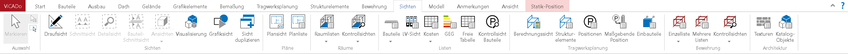 Sichten zeigen den aktuellen Zustand eines Gebäudemodells. Grundrisse, Schnitte, Detailansichten sind beispielsweise solche Sichten. Sie werden in separaten Fenstern angezeigt und verwaltet und lassen sich in unterschiedlichen Maßstäben und Platzierungen auf dem Arbeitsbildschirm anordnen.